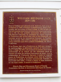 JACK, WILLIAM BRYDONE (dont le second prénom était à l’origine Bryden et qu’on désignait souvent par le nom de famille de Brydone-Jack), mathématicien, astronome, naturaliste et éducateur, né le 23 novembre 1817 à Trailflatt, dans la paroisse de Tinwald (région de Dumfries and Galloway, Écosse), fils de Peter Jack, tailleur de pierres et entrepreneur de bâtiments, et de Janet Bryden ; le 19 décembre 1844, il épousa Marian Ellen, fille de Charles Jeffery Peters*, et ils eurent quatre filles et un fils, puis, en 1859, Caroline Disbrowe (Disbrow), et de ce mariage naquirent une fille et quatre fils ; décédé le 23 novembre 1886 à Fredericton.