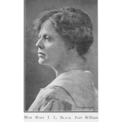 BCA, GR-2951, no.1939-09-552257. Private arch., F. B. Scollie (Ottawa), Letter from Eleanor Todd, 11 Feb. 1983. Daily Times-Journal, 1907–59. “Ft. William: its art development,” Christian Science Monitor (Boston), 5 Sept. 1921: 12. Morning Herald (Fort William), 1909–14. News-Chronicle (Port Arthur [Thunder Bay]), 1920–28. Vancouver Daily Province, 4, 6 Jan. 1939. Brook Abbott, “An accidental librarian: Mary Black of Fort William, Ont. governs the destinies of a library whose motto is hospitality,” Canadian Magazine, 76 (July–December 1931), no.5: 18, 29. As we remember it: interviews with pioneering librarians of British Columbia, ed. Marion Gilroy and Samuel Rothstein (Vancouver, 1970). L. [D.] Bruce, Free books for all: the public library movement in Ontario, 1850–1930 (Toronto, 1994). “The librarian and library of Fort William,” Ontario Library Rev., 1 (June 1916–May 1917): 92–95. T. M. Longstreth, The Lake Superior country (Toronto, 1924). J. R. Lumby, “Retirement of Miss M. J. L. Black from the Fort William Public Library,” Ontario Library Rev., 21 (February–November 1937): 132. Madge Macbeth, “A bookish person,” Canadian Magazine, 51 (May–October 1918): 518–20. Angus Mackay, The book of Mackay (Edinburgh and Madoc, Ont., 1906). “Mary J. L. Black dies in Vancouver,” Ontario Library Rev., 23 (February–November 1939): 5–7. Ken Morrison, “Mary J. L. Black of the Fort William Public Library,” Thunder Bay Hist. Museum Soc., Papers and Records, 11 (1983): 23–31. Eleanor Todd, Burrs and blackberries from Goodwood (Goodwood, Ont., 1980).