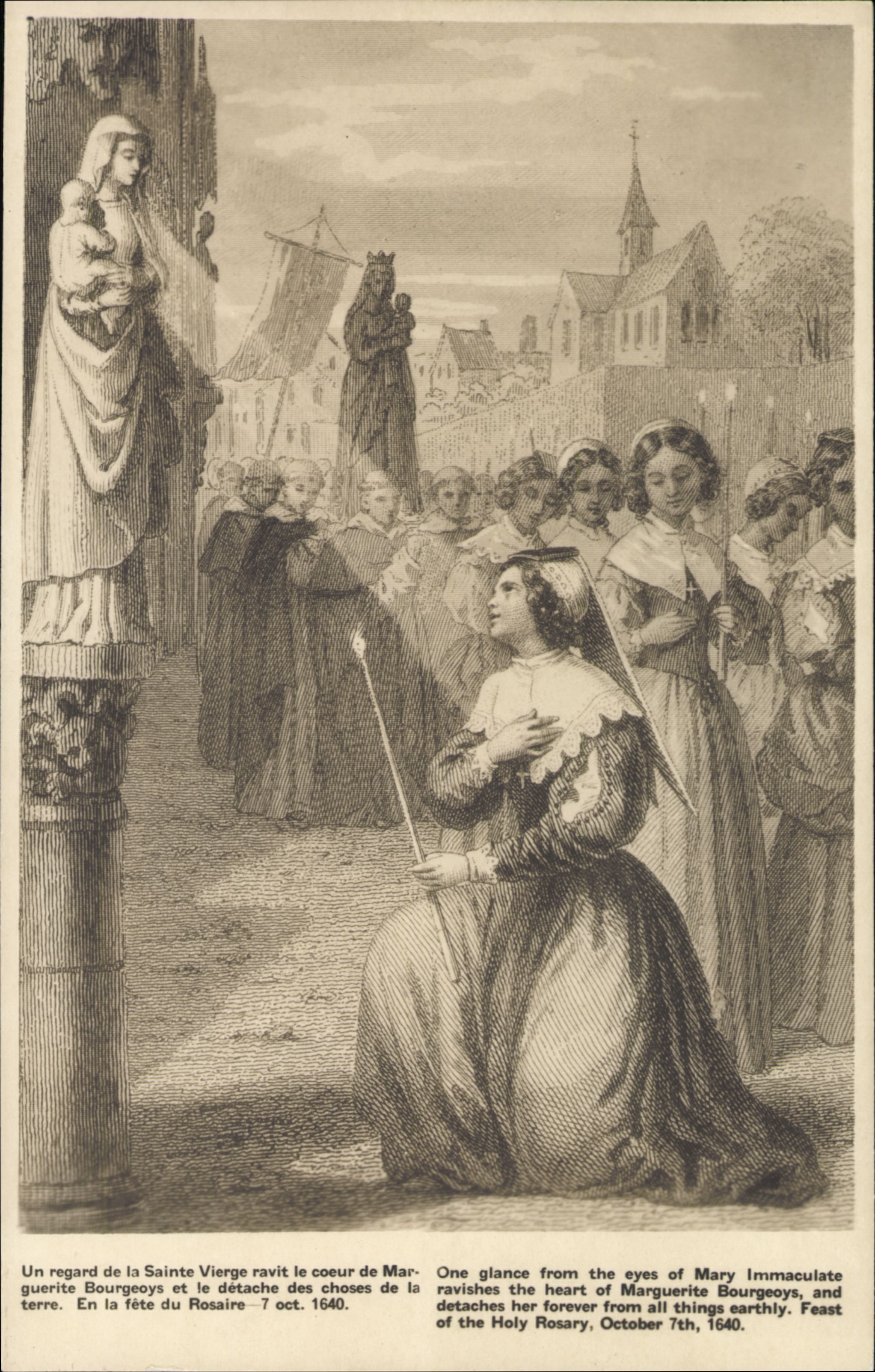“Notwithstanding all the entreaties which had been made to her,” Marguerite Bourgeoys had always refused to enter the external congregation, lest she be “thought a bigot.” But in 1640, during the procession of the Rosary, a sudden unforeseen incident changed her destiny. She wrote: “We passed again in front of the portal of [the abbey of] Notre-Dame, where there was a stone image [of the Virgin] above the door. When I looked up and saw it I thought it was very beautiful, and at the same time I found myself so touched and so changed that I no longer knew myself, and on my return to the house everybody noticed the change, for I had been very light-hearted and well-liked by the other girls.”