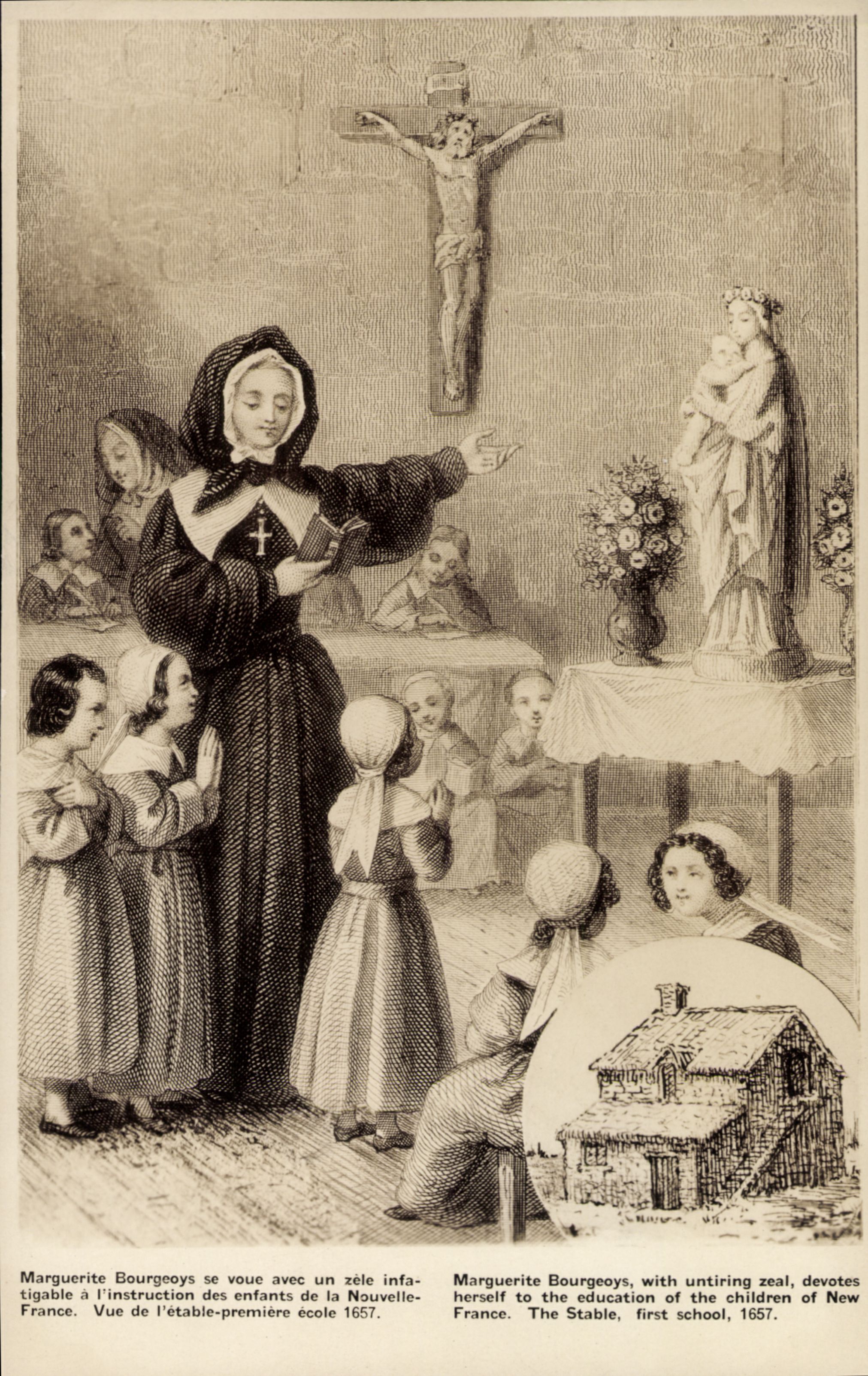 But the mission towards which her inclinations and her natural disposition urged her was teaching. On 30 April 1658 Marguerite Bourgeoys was finally able to receive her first pupils in a stable that had been given her by Maisonneuve for want of something better. The deed of grant stated that it was “a stone building 36 feet long by 18 wide, situated at Ville-Marie, near the Hôpital Saint-Joseph.”