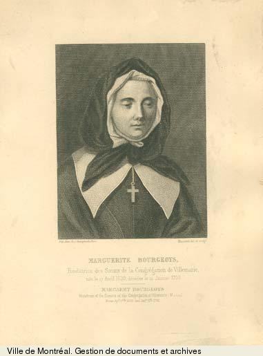 BOURGEOYS, MARGUERITE, dite du Saint-Sacrement, founder of the Congrégation de Notre-Dame de Montréal; b. 17 April 1620 at Troyes in Champagne (France); d. 12 Jan. 1700 at Montreal and was buried there the next day; beatified 12 Nov. 1950 and canonized 31 Oct. 1982.