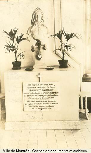 For forming an idea of Marguerite Bourgeoys’s stature in the eyes of her contemporaries, there is no more revealing source than their tributes of esteem and veneration at the time of her death. Popular admiration had already canonized her 250 years before her beatification; the objects which had been placed in contact with her hands, during the afternoon when the public was admitted to see the body lying in the chapel of the Congrégation, were considered relics. The unanimity of the praises addressed to her cannot be misleading. A further testimony of esteem was the discussion about the possession of her remains, which had moreover to be settled by a compromise; the parish of Ville-Marie kept her body and the Congrégation de Notre-Dame her heart.