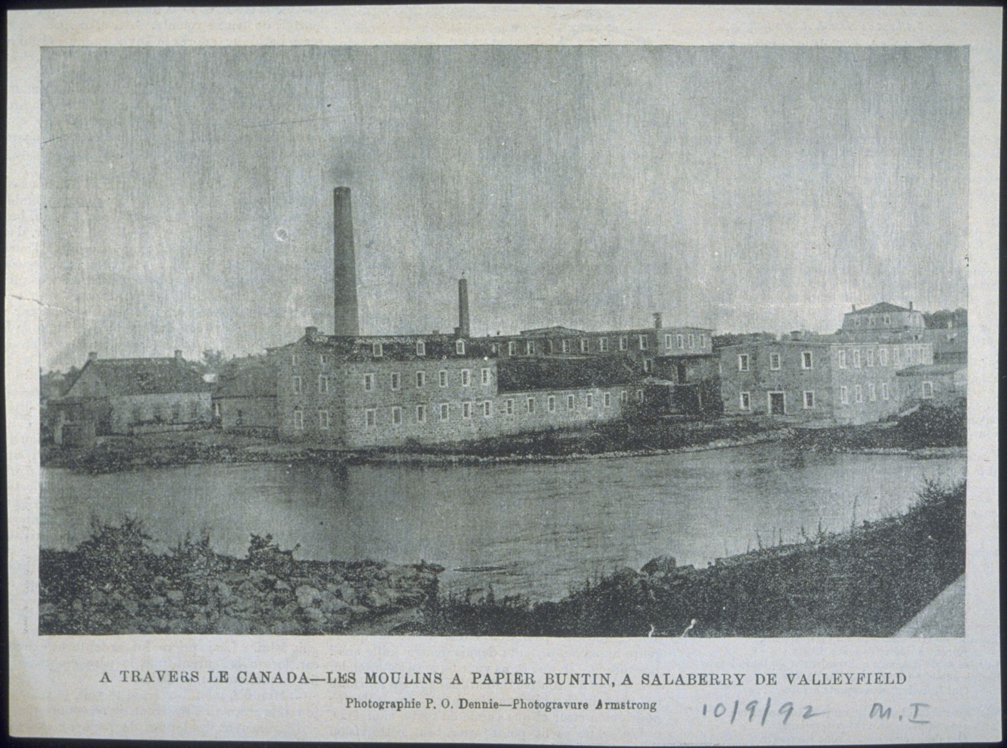 In 1854 the Paper Manufactory, in which Buntin would be involved, was built for William Miller at a place he named Valleyfield (Salaberry-de-Valleyfield), near the Beauharnois Canal. This ultramodern establishment, equipped with an 84-inch-wide Fourdrinier machine, began production in April; two years later it would employ 26 men and 45 women and its worth would be estimated at $48,000 or £12,000. However, apparently finding himself short of liquid assets, Miller sold his Montreal stationery business in 1854. According to historian George Carruthers, Miller, fearing bankruptcy, also transferred his shares in the plant to Buntin for a nominal sum, on the understanding that he would regain control of them later, on terms known only to the two men. Thus Buntin founded Alexander Buntin and Company, probably in the spring of 1854. Carruthers claims, without proof, that in 1856 Buntin refused to transfer the shares back to Miller, who withdrew from the business. Buntin then took his brother into partnership (he had sold him his share in their Hamilton enterprise the previous year); until about 1864 the Valleyfield plant went under the name of A. and J. Buntin. The two also opened Buntin, Brother and Company, a wholesale and retail paper-goods business in Toronto, in 1856. This expansion stemmed from the fact that the Valleyfield mill had markets in Lower Canada for only a third of its annual output, a total that year of 500 tonnes of paper.