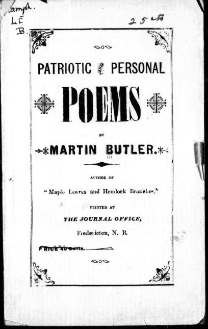 Butler returned to similar themes in a second volume, Patriotic and personal poems (Fredericton, 1898?).