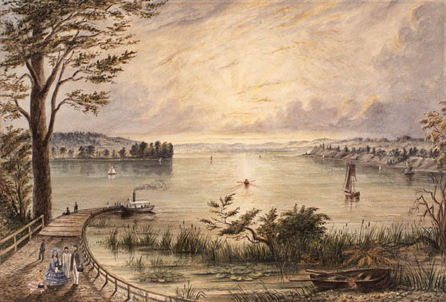 In 1851 Captain Caddy disposed of his land in London and moved to Hamilton where he lived for the next 32 years until his death. After a brief employment as a civil engineer on the Great Western Rail Road, he had turned to painting as his profession. He opened a studio, gave private lessons, and served as art instructor at Wesleyan Female College (later renamed Hamilton Ladies’ College).