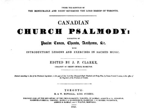 Canadian church psalmody: consisting of psalm tunes, chants, anthems, etc., with introductory lessons and exercises in sacred music, ed. J. P. Clarke (Toronto, 1845). J. P. Clarke, Lays of the maple leaf, or songs of Canada (Toronto, [1853]). Parochial psalmody: a new collection of the most approved psalm tunes . . . , ed. J. P. Clarke (2nd ed., Glasgow, 1831). A selection of chants and tunes, made by the committee of the Toronto Diocesan Synod . . . , [ed. J. P. Clarke et al.] (Toronto, 1861; 2nd ed., Toronto, 1867).