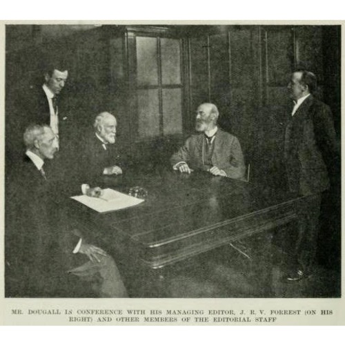 After finishing his bachelor’s degree, Dougall joined the staff of the weekly newspaper founded by his father, the Montreal Witness, the first issue of which had been published in 1846. A daily edition of the paper was added in 1860. J. R. reported on the American Civil War, which the Witness covered in great detail, taking a strong abolitionist stance, and he went to Washington to interview Abraham Lincoln at the Executive Mansion (later known as the White House). He travelled to Europe to cover the Franco-German War and the creation of France’s Third Republic. Upon J. R.’s return to Montreal in the spring of 1871, his father decided to start a new publication in New York and left the Witness in his son’s hands. J. R. remained the publisher and editor until 1913, when he sold the daily edition to the Telegraph Publishing Company Limited, which renamed it the Daily Telegraph and Daily Witness. He had control of the weekly version, however, until just before his death. In 1915 the weekly newspaper had a circulation of more than 22,000. About 1862 J. R. had opened a company with his father called John Dougall and Son, which printed the paper and their subsequent publications; it would operate until 1935, the year after Dougall’s death.
