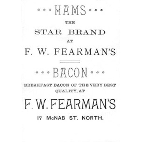 Robert Calver Fearman lived his life according to the examples set by his redoubtable father, founder of the meat-packing firm F. W. Fearman and Company Limited. He was educated in Hamilton’s public schools and collegiate and then at the Dundas Wesleyan Boys’ Institute. Upon graduation, he set to work in the family business as its secretary-treasurer; in January 1899 he and his brothers Frederick Chester, Henry Holbrook, and Frank Dingwall joined their father in incorporating the company. A cautious beginning in curing hams and bacon and rendering lard had blossomed by that time into a concern that employed approximately 110 workers and generated an output worth over $1 million per year. Its famous Star brand of hams and bacon were shipped across Canada and to France, the West Indies, the United States, and Great Britain, where two-thirds of the company’s product was consumed.