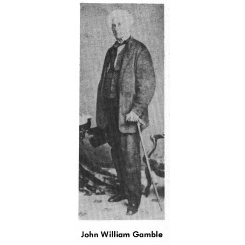 GAMBLE, JOHN WILLIAM, manufacturer and politician; b. 5 July 1799, in the garrison at York (Toronto), U.C., eldest son of John Gamble, loyalist and army surgeon, and Isabella Elizabeth Clarke of Connecticut; m., in 1822, Mary, daughter of James Macaulay* of York, by whom he had five children; in 1834, Matilda Atkinson, by whom he had three daughters; and thirdly the widowed Minerva Anne Niles; d. 12 Dec. 1873 at Pine Grove, Ont.