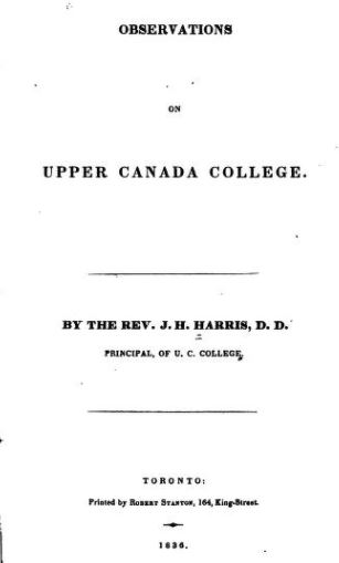 Upper Canada College prospered under Harris’ regime, which lasted until 1838. It saw slow but steady growth (there were some 133 students in 1838) and earned a reputation for academic excellence. Increasingly, however, it came under attack for its apparent catering to the needs of the upper classes, its seemingly narrow classical curriculum, and its lavish endowment. In 1836 Harris published Observations on Upper Canada College in which he defended the school as a public institution, but his pamphlet did not allay criticism.