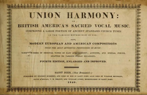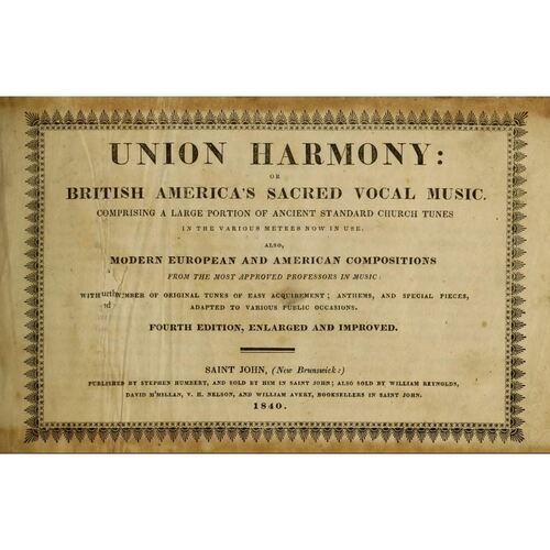 To meet the needs of his singing-school classes Humbert compiled his own tune-book, which he had printed in New England in 1801. That November he advertised “the union, harmony, or British America’s sacred vocal music” as ready for sale in Saint John, Fredericton, Annapolis Royal, and Halifax (where Thomas Daniel Cowdell* acted as his agent). The volume contained an introduction on the principles of vocal music and a collection of anthems, hymn tunes, and texts selected by Humbert from the New England tune-books available to him. According to his advertisements, the 1801 edition contained a number of original tunes by the compiler. The second edition, printed late in 1816 or early in 1817 by C. Norris and Company of Exeter, N.H., was “much improved and enlarged.” It included a comprehensive “Introduction to the Grounds of Musick,” with vocal exercises, borrowed verbatim from the 1817 edition of The village harmony, or youth’s assistant to sacred musick . . . , a popular New Hampshire tune-book, as well as a large complement of British tunes and anthems and a number of original tunes. Some of Humbert’s own works bore distinctive titles, such as “St. John,” “Gagetown,” “Sussex Vale,” “Halifax,” “Carleton Side,” and “Frederickton.” The texts were set in three or four parts with the tune placed in the tenor voice according to contemporary custom. Union harmony was intended for use primarily as a singing-school textbook, but Humbert ambitiously hoped that it might also serve as an anthem- and hymn-book. Indeed, he may have increased the number of British tunes in the second edition to make the work more suitable for use in British Methodist and Anglican church services. The volume was reissued with additional new materials in 1831 and 1840. Humbert appears to have continued conducting periodic singing schools in Saint John until at least 1840 when he founded a sacred music society.