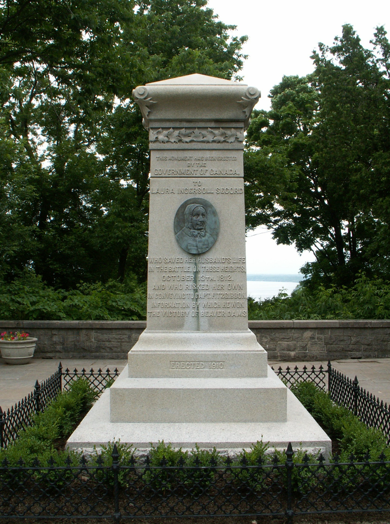 Laura Secord became celebrated as a heroine in history, poetry, and drama, after 1860. Legends grew; the favourite was that she had taken a cow with her on her walk, for camouflage, and that she had milked it in the presence of American sentries before leaving it behind in the woods. In fact, Mrs Secord never mentioned a cow and it is unlikely that she encountered an American sentry. William F. Coffin* apparently invented the episode for his book 1812, the war and its moral (1864). According to another story, Laura had walked through the woods at night, on her bare feet. But she herself said, “I left early in the morning,” and though she may have lost a slipper in the woods or fields, she was far too sensible to have started out barefoot. Her popular fame was such that two monuments were erected in her honour, one at Lundy’s Lane in 1901, the other on Queenston Heights in 1910. Her portrait was hung in the parliament buildings at Toronto, and a memorial hall was established in the Laura Secord School at Queenston.