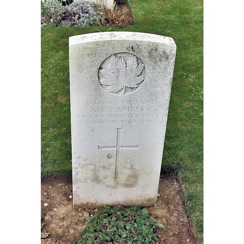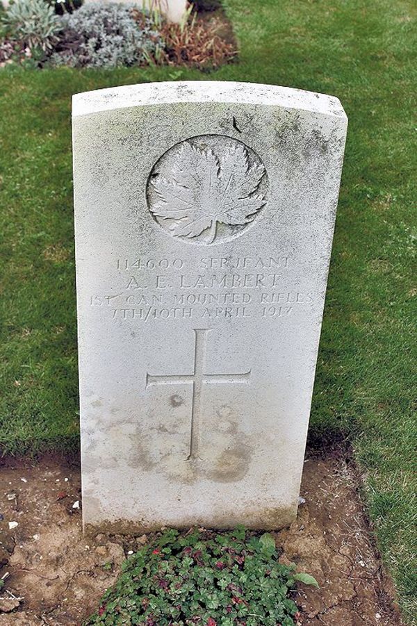Early in 1917 he suffered another bout of influenza but hurried back to his now battle-wise unit to take part in the final preparations for the attack on Vimy Ridge. The 1st CMR stormed up the Vimy slope early on Easter Monday, 9 April, and by 9:00 a.m. was consolidating on its objective, the eastern end of Bois de la Folie, in the centre of the ridge. Before the end of the next day Lambert had been killed. Such was the intensity of the battle that the time and the place of his death were unknown to his surviving comrades.