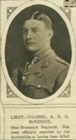 McKenzie was undoubtedly New Brunswick’s most distinguished soldier in World War I. Throughout the province, as in his regiment, his death was counted a great loss. Premier Foster referred in the Legislative Assembly to the bright prospects McKenzie had given up and said of him that “no soldier ever did better service for his country, and none will be more greatly missed.” McKenzie had been a man who sought to lead and who died as he had always lived, vigorous, busy, and fully committed to the tasks at hand. He personifies those many talented Canadians whose abilities were lost to their provinces and the country when they fell in the Great War.