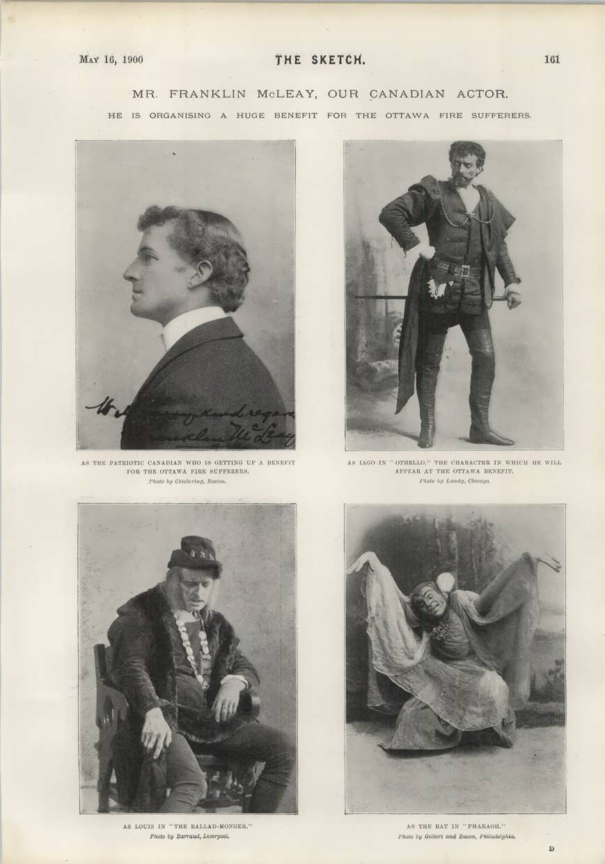 Then, suddenly, at the age of 36, McLeay’s short, meteoric career ended. On 26 April 1900, in Canada, fire devastated Ottawa and Hull. McLeay organized a giant benefit to raise money for the thousands of homeless families. Called “The Canadian Matinee,” it began at 12:30 p.m. on Tuesday, 19 June, at the Drury Lane Theatre in London. Queen Victoria was the patron and the Prince of Wales booked a box for the occasion. The matinée lasted about six hours, during which the reigning stars of London’s stage performed a pot-pourri of musical and dramatic selections. Tree essayed a few scenes from Othello for the first time in his career, with McLeay supporting as Iago. They were planning to mount a full-scale production in the autumn, but the preview proved to be the only time London saw McLeay’s Iago. Although an anonymous critic in the Times acknowledged, “How could any one judge their efforts fairly with the refrain of a comic song still ringing through the theatre,” both players were chided for forcing their interpretations. Obviously the tensions and responsibilities of the undertaking were immense. In addition, there were legitimate protests because, by June, the Ottawa fund had been oversubscribed, though McLeay could not have foreseen this when he undertook to organize the performance. A memorandum was inserted into the program stating that “no question of charity was involved. The matinée was intended as an expression of the sympathy of the dramatic profession with their fellow-subjects of the Dominion.” It was left to Governor General Lord Minto [Elliot*] and Prime Minister Sir Wilfrid Laurier* to distribute the $15,000 that was raised; the Toronto Globe reported a suggestion that the money go to help famine victims in India. On top of all this the “highly strung” McLeay was playing every night in the weeks preceding the matinée and even on the evening immediately following it. The Times said that “the labours and worries of his task overtaxed his brain.” The Globe noted that he died on 6 July 1900 of “brain fever, after an illness of some weeks.” Charlesworth, writing in 1925, said that he “took a chill, and, already run-down from overwork . . . died of pneumonia within three days.” Altogether McLeay had played more than 40 roles.