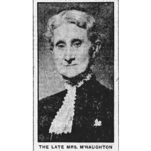 McNaughton participated in the Woman’s Christian Temperance Union at the local and provincial levels. She was a member of two city unions, the Victoria Union (called the Central Union from 1900 to 1904) and the short-lived Willard Union, named after WCTU founder Frances Elizabeth Caroline Willard. The two unions amalgamated in 1904 under the name Victoria Union. McNaughton served as president of the Victoria Union from 1902 to 1907. In 1900, with her daughter Cecilia, she had run the Willard Union’s mission hall, in which capacity she held gospel services, hosted Sunday concerts, and provided lunches for men, many of whom were “needy cases.” As well, she acted as a hospital visitor.