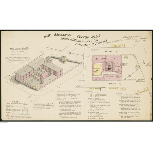 William Parks had left Ireland for Saint John in 1822, and by 1828 he had established a partnership there with his brother-in-law John Hegan. Over the years their firm was involved in groceries, dry goods, and shipping. After the partnership was dissolved in 1846, William, together with his eldest son, Samuel (1823–63), took over the shipping end of the business as William Parks and Son, and made a name for himself as one of Saint John’s great merchants. On joining the business, John’s first assignment was to go to England to purchase machinery for the small steam-powered cotton mill on Wall Street in Portland that his father hoped would win a place in a domestic market dominated by British imports. The New Brunswick Cotton Mill (or Mills) was a bold undertaking. To be sure there had been cotton mills in British North America since the 1840s and at least one may have preceded the Wall Street operation in the Maritimes, but the Parks mill was among the first successful domestic cotton mills.