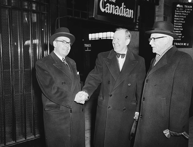 The Liberals, with St-Laurent as leader, Pearson as his likely successor, and a Gallup poll forecasting another solid majority, called an election for 10 June 1957. The polls were wrong; Progressive Conservative leader John George Diefenbaker’s appeal to Anglo-Canadian nationalism was effective in western Canada, the Maritimes, and British Ontario. His eloquent denunciation of the Liberal minister of trade and commerce, Clarence Decatur Howe*, and the pipeline fiasco had also persuaded electors to vote Conservative. The American-born Howe had used closure to force a bill through the commons to create an American-financed pipeline which would bring western natural gas to Ontario. The Conservatives had opposed it bitterly because of American involvement and had sung “God save the queen” to emphasize their traditional British-Canadian nationalism. The Conservatives won 112 seats with over 38 per cent of the vote and the Liberals 105 seats with over 40 per cent of the vote. After some indecision, St-Laurent resigned as prime minister and as Liberal leader. Pearson was the strong favourite in the Liberal leadership race, especially after he was awarded the Nobel Prize. He became head of the party on 16 Jan. 1958.