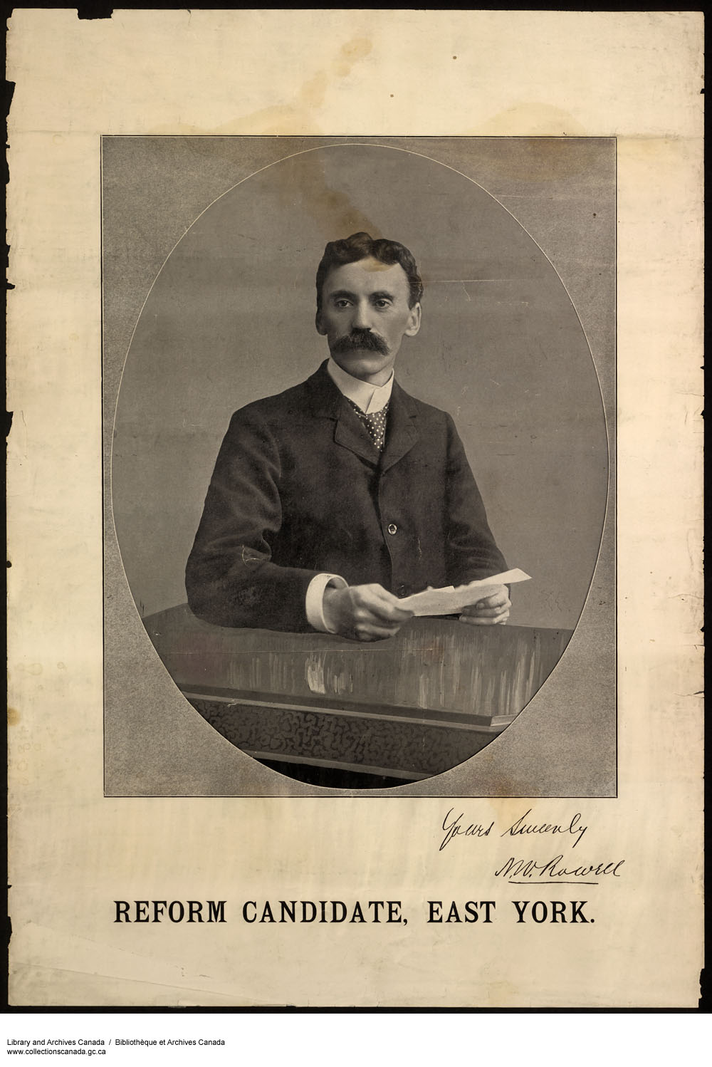 Rowell’s rise in the legal profession was accompanied by increasing prominence in the Methodist Church and in the Liberal Party. In November 1889 he had been designated a Methodist lay preacher, in 1892 he was the youngest man ever elected a lay delegate to the church’s Toronto Conference, and he was in constant demand as a lay preacher and champion of the temperance movement. Despite a rather thin, high-pitched voice and a reputation in some quarters for excessive seriousness and an addiction to statistics, he could command audiences in diverse settings. He spoke on behalf of younger Liberals at a testimonial dinner when Sir Oliver Mowat* retired from the premiership in 1896. In the federal election held on 7 Nov. 1900 he was defeated in York East, near Toronto, by Conservative William Findlay Maclean*. A primary issue in the contest was Canada’s part in the South African War. Although Rowell thought otherwise, he did not publicly deviate from Prime Minister Sir Wilfrid Laurier*’s assurances that sending volunteers to South Africa would not be a precedent. Rowell believed that participation in the conflict could demonstrate Canada’s growing importance in the empire, and the fact that English and French soldiers were fighting side by side might break down cultural barriers. Ironically, his campaign was weakened by English-French acrimony arising from the attitudes and utterances of Quebec mp Joseph-Israël Tarte*.