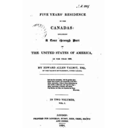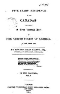 Edward Allen Talbot’s Five years’ residence in the Canadas: including a tour through the United States of America, in the year 1823 (2v., London, 1824) was reprinted in one volume in East Ardsley, Eng., and New York in 1968.