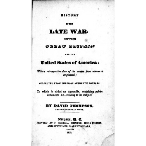 David Thompson, History of the late war between Great Britain and the United States of America; with a retrospective view of the causes from whence it originated . . . (Niagara, [Ont.], 1832; repr. Toronto, 1845; [New York], 1966). PAC, RG 1, L3, 498, no.118; RG 8, I (C series), 36, pp.325–29; 199, pp.68–69. St Mark’s Anglican Church (Niagara-on-the-Lake, Ont.), burial register. Can., Prov. of, Legislative Assembly, Journals, 1854–55, III, app.B, table L. Niagara Gleaner (Niagara, [Ont.]), 1818–37. Niagara Mail (Niagara, Ont.), 3 June 1868. Literary history of Can. (Klinck et al.), 214.