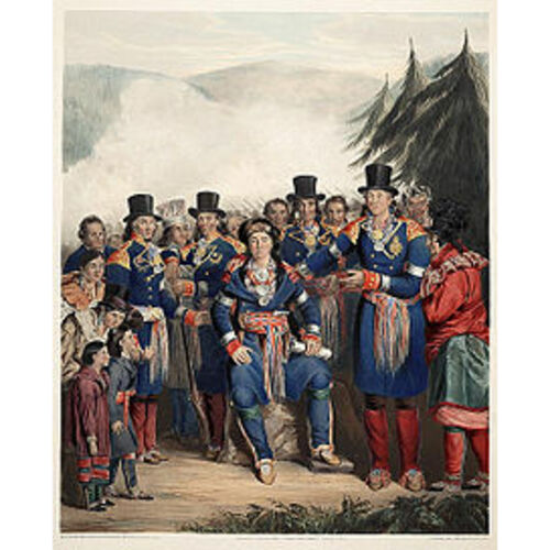 Grand Chief Vincent then made a speech in French to the sovereign that was an admirable and brief example of Indian rhetoric: “I was instructed not to speak in the royal presence unless in answer to your Majesty’s questions; but my feelings overpower me; my heart is full; I am amazed at such unexpected grace and condescension, and cannot doubt that I shall be pardoned for expressing our gratitude. The sun is shedding its genial rays upon our heads. It reminds me of the Great Creator of the Universe – of him who can make alive and who can kill. Oh! may that gracious and beneficent Being, who promises to answer the fervent prayers of his people, bless abundantly your Majesty! May he grant you much bodily health; and, for the sake of your happy subjects, may he prolong your valuable life. It is not alone the four individuals who now stand before your Majesty who will retain to the end of their lives a sense of this kind and touching reception; the whole of the nation, whose representatives we are, will ever love and be devoted to you their good and great father.”