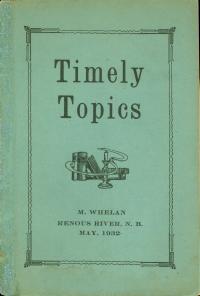 Copies of Michael Whelan’s 18 published collections of poetry are scattered among many New Brunswick libraries, none of which has a complete set. In his introduction to Michael Whelan, folk poet of Renous River: a collection of his poetry (Fredericton, 1990), M. O. Nowlan describes some of the difficulties in compiling a comprehensive bibliography of Whelan’s work. The book includes an annotated list in an appendix. Whelan’s publications are: Poems and songs (Newcastle, N.B., 1895); Queen of the north and other songs and sonnets (Newcastle, 1914); Songs of the World War (Renous River, N.B., 1916); The pioneers and other poems ([Newcastle], 1917); The great Miramichi fire, 1825; the polar heroes; and fourteen other poems (Chatham, N.B., 1921); The call of Christ and other poems (Chatham, 1922); “In memoriam”: men and women of Miramichi (Renous River, 1923); The maid of the Miramichi and other poems (Chatham, 1924); The great Miramichi fire of 1825 in story and song, with other poems (n.p., 1925); The sacred silence and other poems (n.p., [1925?]); The garden of God and other poems (Renous River, 1926); Canada: queen of the north: the all-Canadian edition for the 60th anniversary of confederation (Chatham, 1927); The Dungarvon Whooper and other songs of the Miramichi (Renous River, 1928); Some heroes of history (Renous River, 1928); Piracy, prophecy, politics and poetry (Chatham, 1929); The book beautiful (Chatham, 1930); Slogans and other songs ([Renous River, 1930?]); and Timely topics (Renous River, 1932).