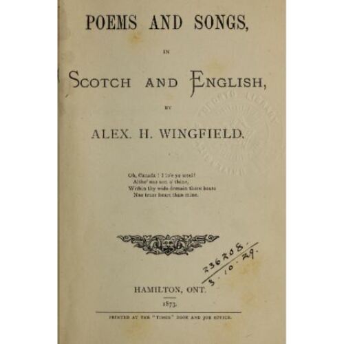 In Hamilton, Wingfield was popular as a poet. He wrote about common scenes and everyday life, about people, his love for Scotland, and his pride in Canada. In 1873 he published in Hamilton Poems and songs, in Scotch and English, a 255-page volume of his verse that he dedicated to Joseph Price, the general manager of the Great Western. The 1,500 copies of the book were sold within three weeks. Able to compose verse spontaneously, Wingfield was a popular entertainer at banquets and meetings, including those of the Victoria Lodge of the Independent Order of Foresters, of which he was a member.