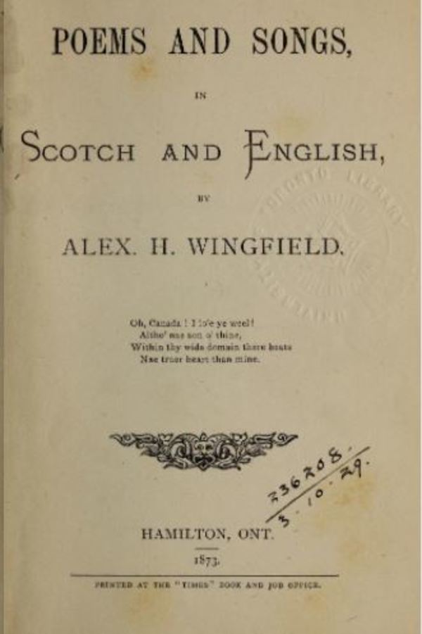 In addition to Poems and songs, in Scotch and English (Hamilton, Ont., 1873), Alexander Hamilton Wingfield’s publications include The centennial: an international poem (Toronto, 1878) and the lyrics for two compositions by local musicians: Fair Canada: patriotic song (Ottawa, 1873), set to music by George Frederick De Vine, and Under the snow (not lost but gone before) (Toronto, 1878), composed by Robert Steele Ambrose*. The latter song is reproduced in The Canadian musical heritage, ed. Elaine Keillor et al. (9v. to date, Ottawa, 1983– ), 3: 175–77.