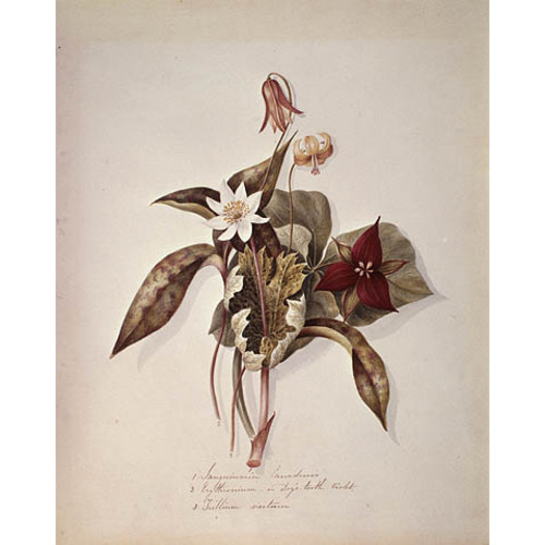 In 1841 Captain Bayfield transferred his hydrographic headquarters and his residence to Charlottetown. Fanny continued to paint, improving her technique and developing her own style. She gave lessons in painting, and perhaps also in music, to women there. Over the years she acquired a knowledge of wild flowers and painted them realistically in watercolours. A leather-bound album, “Canadian wild flowers,” was presented to the Public (National) Archives of Canada by a granddaughter of the artist. Among the 70 paintings in the album are depictions of flowers, mushrooms, and maple leaves in autumn. On a detached sheet is “Bloodroot, Dog’s Tooth Violet and Red Trillium,” a beautiful, natural-looking representation. Studies of butterflies, moths, and caterpillars complete the collection.