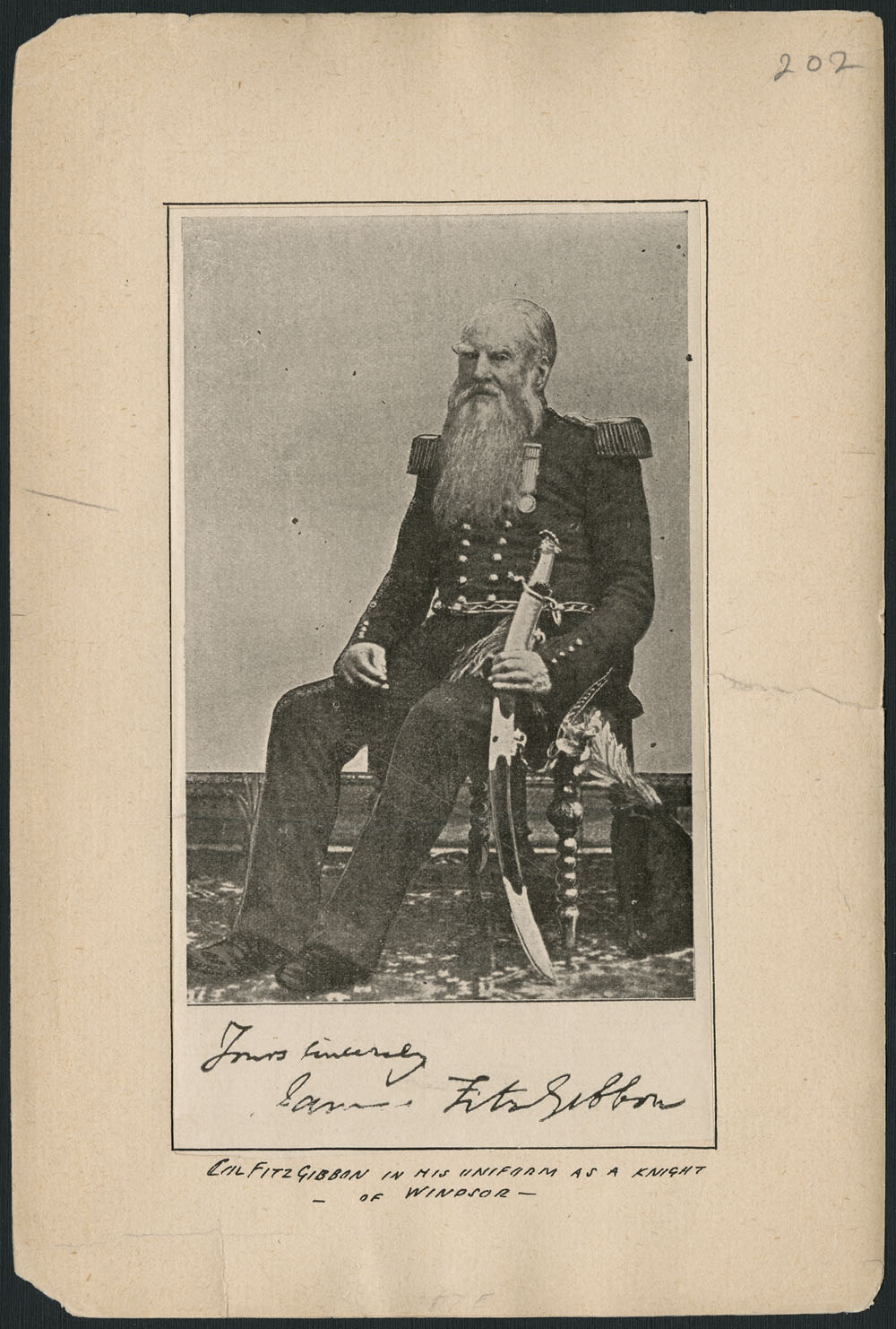 FitzGIBBON, JAMES, soldat et fonctionnaire, né le 16 novembre 1780 à Glin (comté de Limerick, République d’Irlande), fils de Garrett (Gerald) FitzGibbon et de Mary Widenham ; il épousa en 1814 Mary Haley qui lui donna plusieurs enfants, dont quatre fils et une fille qui dépassèrent le bas âge ; décédé le 12 décembre 1863 au château de Windsor en Angleterre.