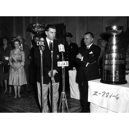 Durant les années 1950, le Tricolore fait la pluie et le beau temps dans la LNH et la popularité du Rocket décuple. Le club de Montréal participe à la finale de la coupe Stanley dix fois de suite et la remporte six fois. L’arrivée de la télévision permet aux Canadiens, francophones et anglophones, qui connaissent tous Richard, de le voir en action et battre des records, comme en ce 8 novembre 1952, où il compte son 325e but en carrière contre Chicago, dépassant la marque de 324 d’un ancien joueur des Maroons, Nelson Robert Stewart. En 1953-1954, il écrit de plus une chronique sur le hockey dans l’hebdomadaire montréalais Samedi-dimanche. Dans un de ses billets, il commente une décision qu’a prise Clarence Campbell*, président de la LNH, au sujet de Bernard (Boum Boum) Geoffrion*. Il la croit injuste. Les pressions de Campbell - qui pour plusieurs représente l’establishment anglophone et francophobe de Montréal - pour empêcher Richard d’écrire portent fruit. À la veille de l’événement le plus important de la carrière du Rocket, les tensions entre les deux hommes sont à leur plus haut point.