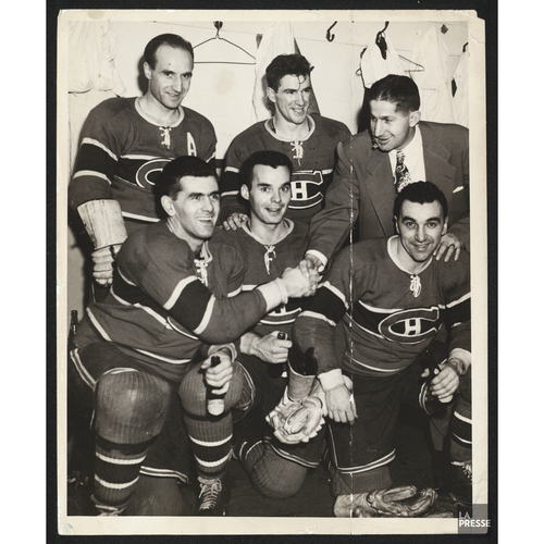La punch line établit d’autres records en 1944-1945. Avec 80 points, Lach finit premier compteur de la LNH ; Blake en a 67. Le trio réussit l’exploit de totaliser 220 points pendant la saison. Le Rocket compte 50 buts en 50 parties, éclipsant les 44 buts en 20 parties qu’a marqués Maurice Joseph Malone en 1917-1918. En temps de guerre, ces records sont cependant vus d’un mauvais œil par plusieurs journalistes. Constantine Falkland Cary Smythe*, propriétaire des Maple Leafs, a levé un régiment et a encouragé les hockeyeurs à s’enrôler ; c’est ainsi que, pendant la Deuxième Guerre mondiale, le club torontois est amputé de plus de la moitié de ses joueurs. La situation est différente au Canadien, ce qui fait jaser : l’équipe de Montréal profiterait de la guerre pour remporter des victoires. Les résultats des saisons suivantes démentent cette impression. Malgré le retour des soldats, le Bleu-Blanc-Rouge gagne en effet la coupe Stanley contre les Bruins en 1945-1946. Richard a compté 27 buts pendant la saison et 7 buts au cours des séries. En 1946-1947, il marque 45 buts et reçoit le trophée Hart, remis au joueur le plus utile. Les détracteurs doivent se rendre à l’évidence et l’applaudir. Même Smythe avoue que Richard est le meilleur joueur ; il tentera d’ailleurs à plusieurs reprises d’acheter son contrat du Canadien en offrant jusqu’à 135 000 $.