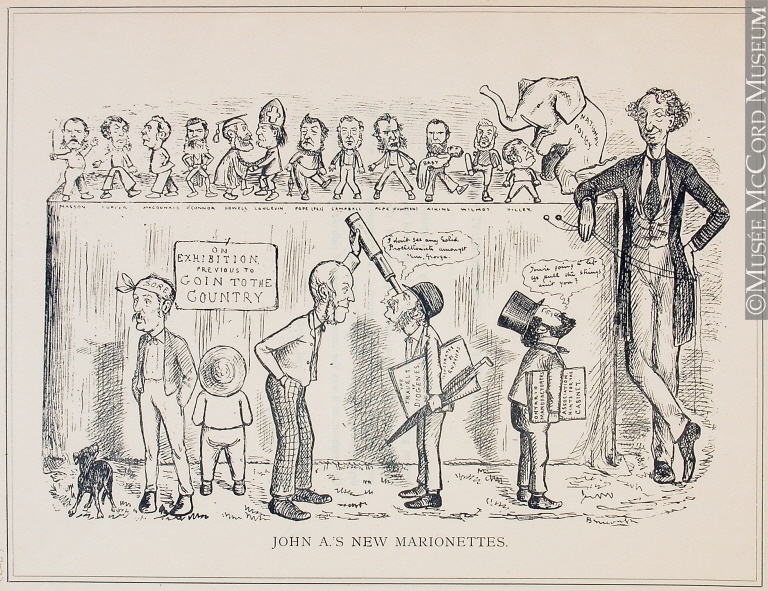 Dans les premières années, le Grip n’avait pas d’orientation politique précise. Accabler George Brown de sarcasmes lui permettait de se prétendre indépendant, mais il n’était pas tendre non plus avec les conservateurs. Sa sévérité envers eux s’accentua après le scandale du Pacifique, en 1873, qui permit à Bengough d’exprimer, surtout par des illustrations, une indignation sans bornes. Ce fut d’ailleurs à la faveur de cette controverse que le Grip conquit un vaste lectorat. Souvent reproduites, les caricatures dessinées par Bengough pendant cette période captaient les traits dominants de Macdonald. Son nez proéminent, son regard sournois, sa coiffure à la mode et son allure nonchalante contrastaient, par exemple, avec l’air intègre du presbytérien écossais Alexander Mackenzie*. « Je reconnais volontiers avoir pris l’argent et corrompu les électeurs, déclare le Macdonald de Bengough. Où est le mal ? » Bien sûr, il ne posait cette question que pour la forme.