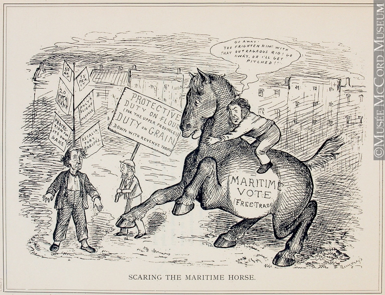 Le programme de Bengough contenait plusieurs articles familiers à ses contemporains désireux de réformer les mœurs. Convaincu que les boissons alcooliques avaient des effets particulièrement dévastateurs chez les ouvriers, Bengough en préconisait ardemment la prohibition. Toujours dans l’intérêt de cette classe sociale, il s’opposait à ce que les tramways circulent le dimanche afin que le jour du Seigneur continue d’être consacré au repos. De même, après avoir dénoncé « [les] redresseuse[s] de torts », il revint sur ses positions et prit parti dans les années 1880 pour le suffrage féminin et l’admission des femmes dans des professions, le droit entre autres. Il alla cependant au delà de ces modestes revendications, peut-être parce que, de plus en plus, il se rendait compte que des plaies sociales comme l’alcoolisme avaient des causes plus profondes. Dès les années 1880, il avait découvert et adopté l’analyse que l’Américain Henry George faisait des maux du capitalisme industriel, alors en pleine émergence. Dans Progress and poverty, paru en 1879, ce critique de la société, dont le ton moralisateur plaisait à Bengough, expliquait que l’existence de la pauvreté au milieu de l’abondance engendrée par la science et la technique découlait de l’injustice du régime fiscal. Ce régime n’imposait pas la plus-value des terres dont la valeur augmentait non pas à cause du travail du propriétaire, mais à cause de la hausse de la demande résultant de la croissance démographique. En même temps, le tarif protecteur favorisait artificiellement les monopoles et l’inflation. Le remède de George, appelé par Bengough « la solution définitive », allait de soi : impôt unique sur la plus-value foncière et libre-échange. La découverte des enseignements de Henry George transforma pour de bon Bengough en zélateur de l’impôt unique. Dans l’espoir que l’instauration de cette mesure régénérerait la société industrielle, « ce simulacre de christianisme », il la prôna par des dessins humoristiques, des écrits et des tournées de conférences dans tout le Canada et même en Australie. Au cours de cette croisade, il attaqua la Politique nationale de Macdonald, tonna contre les monopoles, épousa la cause des agriculteurs et des ouvriers, et vilipenda tous ceux qui restaient aveugles aux lumières de Henry George, y compris son ami George Monro Grant*, recteur du Queen’s College de Kingston, et son ennemi Goldwin Smith*. Un groupe enthousiaste de réformateurs s’associa à lui : Thomas Phillips Thompson*, socialiste et adepte d’Edward Bellamy, Samuel Thomas Wood*, auteur d’articles sur l’économie et la nature dans le Globe, ainsi que d’autres membres de la Toronto Anti-Poverty Society, des Chevaliers du travail et des Patrons of Industry.