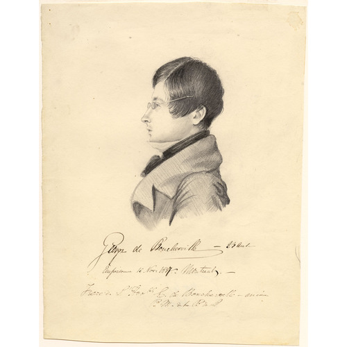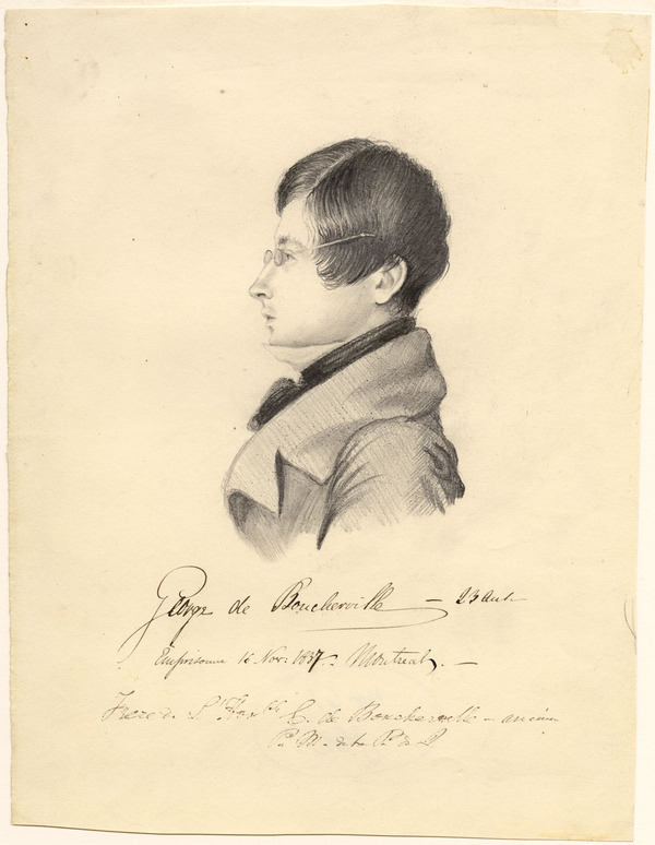 De 1822 à 1832, Georges de Boucherville étudie au petit séminaire de Montréal, où s’affirme son goût pour les mathématiques, l’histoire et l’anglais. En 1833, il commence un stage de clerc en droit auprès de Benjamin Beaubien, qu’il poursuit chez Alexander Buchanan*. Parallèlement, il se consacre à la littérature et, le 2 mai 1835, paraît sa première nouvelle, la Tour de Trafalgar, dans l’Ami du peuple, de l’ordre et des lois. En septembre, il publie dans le même journal Louise Chawinikisique, conte mélodramatique inspiré de Chateaubriand, qui lui vaut le premier prix d’un concours littéraire organisé par le journal.