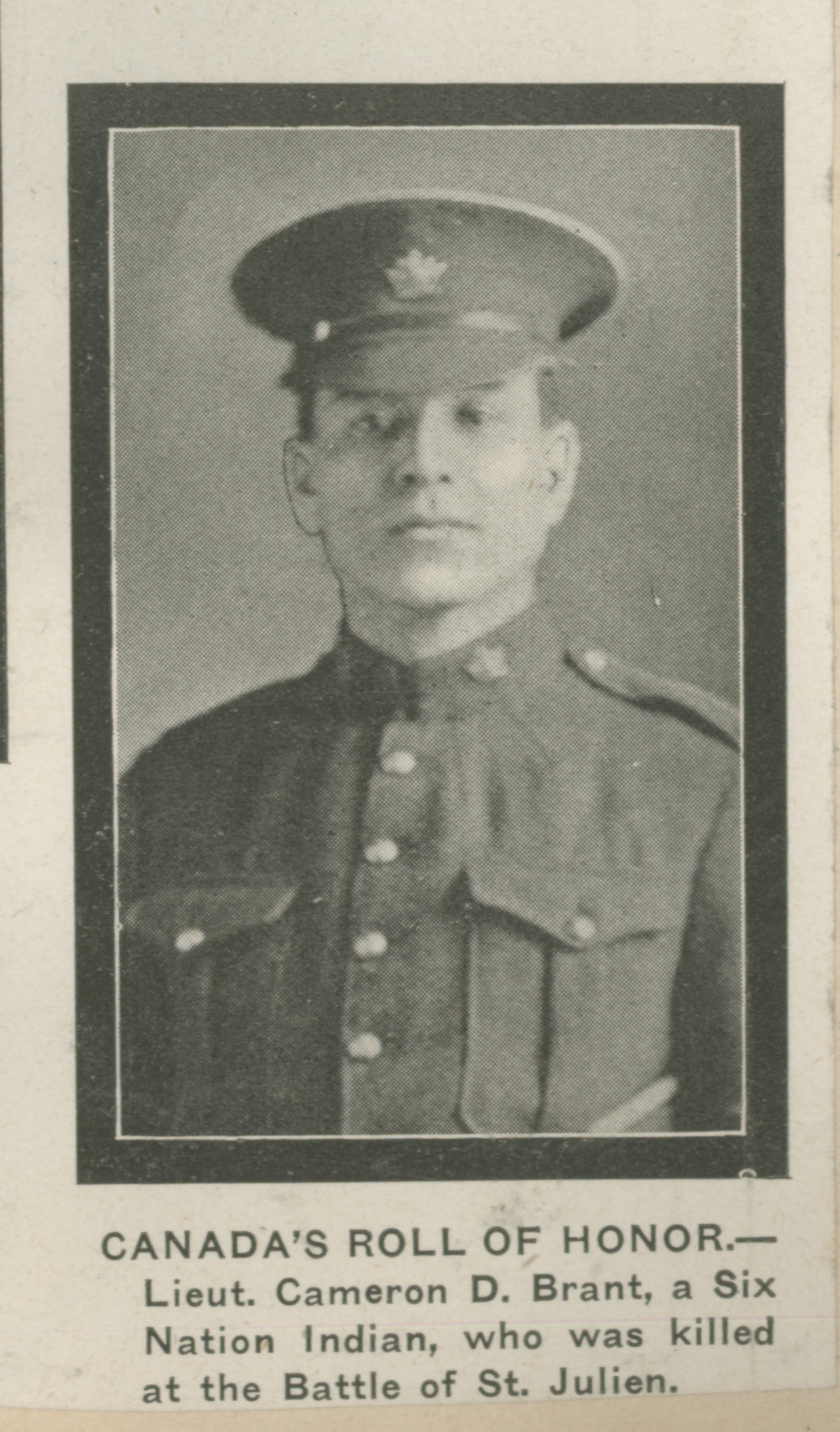 Cameron Dee Brant fut parmi les premiers des quelque 300 hommes des Six-Nations à s’enrôler dans l’armée canadienne pendant la Première Guerre mondiale et le premier des 30 qui moururent au combat. Au cours d’une cérémonie organisée par le maire de Brantford et d’autres notables du lieu, le comté de Brantford lui rendit hommage, comme le conseil héréditaire des Six-Nations. En 1919, à l’église méthodiste de New Credit, les Mississagués dévoilèrent une plaque commémorative en l’honneur du lieutenant Cameron D. Brant, le guerrier mohawk qui avait vécu et prié parmi eux.