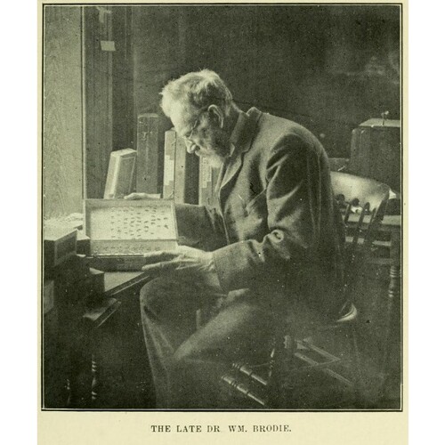 William Brodie avait quatre ans lorsque sa famille immigra dans le Haut-Canada et, suivant le conseil de William Lyon Mackenzie*, s’établit dans une ferme du canton de Whitchurch, près de Toronto. Sa mère, femme instruite et ambitieuse, nourrit chez lui une passion pour la flore et la faune des environs. Après de courtes études dans des écoles locales, il commença à enseigner dans les cantons de Whitchurch et Markham. Il étudia aussi l’art dentaire et, le 20 janvier 1870, après en avoir passé les examens, il fut admis au Royal College of Dental Surgeons of Ontario. Il pratiquerait dans le canton de Markham et à Toronto durant plus de 40 ans. On dit qu’il fut le premier dentiste de Toronto à anesthésier ses patients au chloroforme. Cependant, cette profession était pour lui « un moyen de gagner [sa] vie » ; elle lui permettait de se consacrer à l’histoire naturelle, et surtout à l’entomologie. On raconte que sa passion pour cette science était telle que, au moins une fois, il envoya chez un autre dentiste un patient affligé d’une rage de dents parce qu’il était en train de discuter de spécimens entomologiques avec un visiteur.