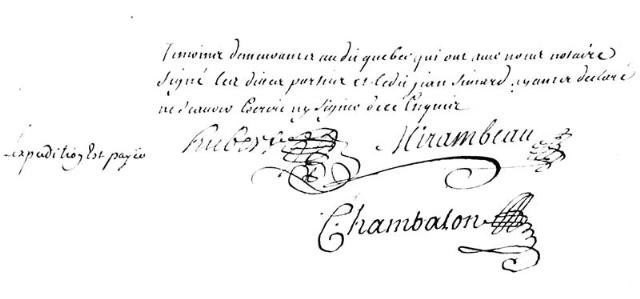 En apparence, Chambalon était moins besogneux que ses confrères. Mais il n’est pas sûr que dans la réalité ce fût vrai. Il était, par exemple, l’un des actionnaires de la Compagnie de la Colonie, y ayant souscrit 4 000# ; or une note contemporaine affirme qu’il n’avait rien et devait beaucoup. C’était à vrai dire le triste lot de presque tous les commerçants de la Nouvelle-France, qui retenaient une bien faible part des profits de la traite, empochés quasi en entier par les fournisseurs et les armateurs de la métropole. La situation de Chambalon allait encore s’aggraver. Souffrant terriblement de la goutte et de violents maux de côté, au point d’être impotent deux mois sur trois, il dut abandonner, probablement vers 1706, son activité commerciale. En 1707, du fait de la baisse d’activité de Chambalon, l’intendant nommait Jean-Étienne Dubreuil notaire à Québec. Deux ans plus tard, Chambalon sollicitait du roi une pension, qu’il ne semble pas avoir touchée. Dans un effort pour conserver sa clientèle, encore imposante, il prit en 1710 un clerc, René-Claude Barolet*, qui serait appointé notaire en 1728.