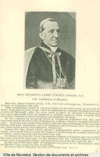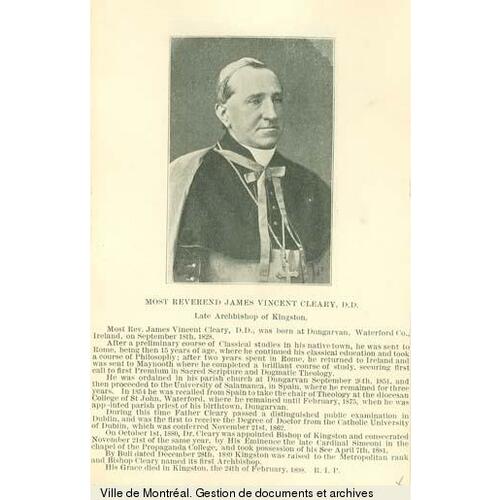 CLEARY, JAMES VINCENT, prêtre catholique et archevêque, né le 18 septembre 1828 à Dungarvan, comté de Waterford (république d’Irlande), fils de Thomas Cleary et de Margaret O’Brien ; décédé le 24 février 1898 à Kingston, Ontario.