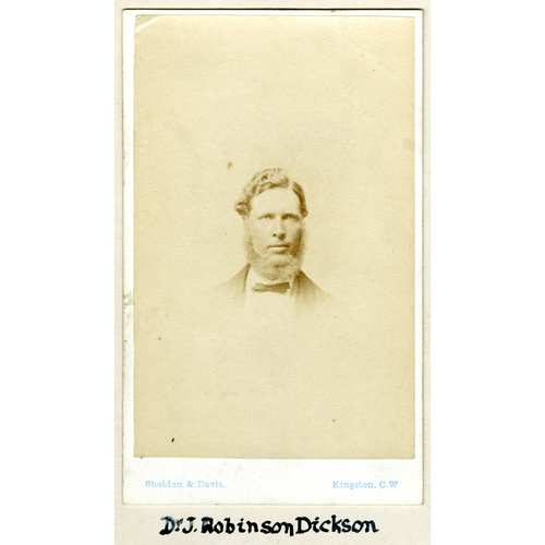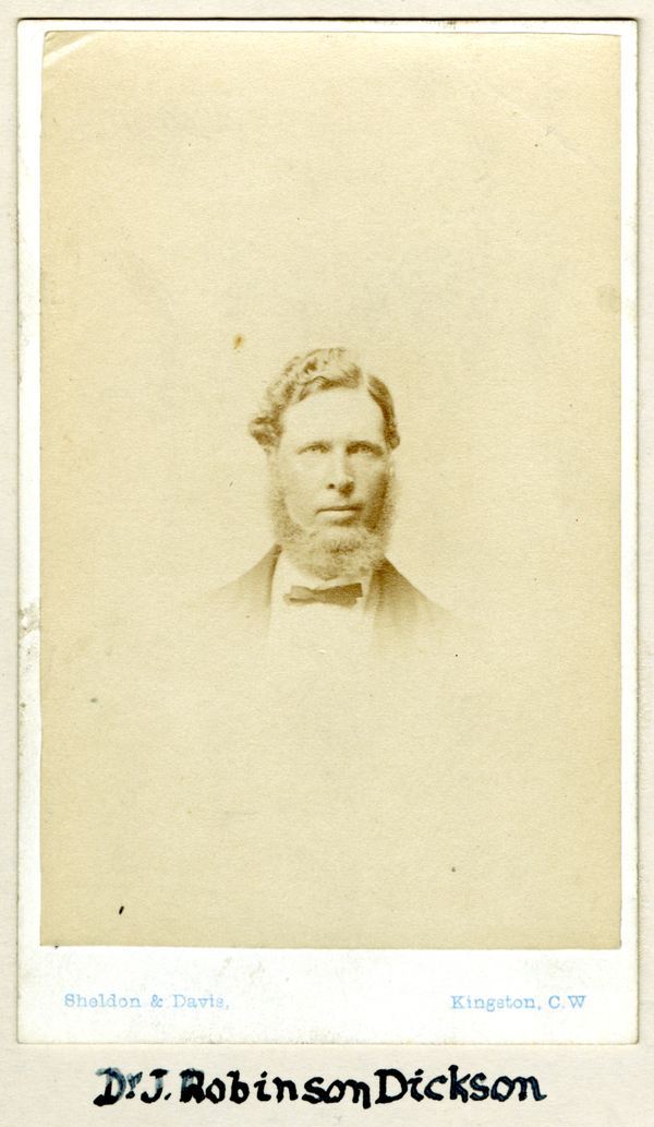 En 1829, John Robinson Dickson était en apprentissage chez un pharmacien. Il ne termina pas le stage, d’une durée de six ans, mais étudia quelque temps à la Royal Belfast Academical Institution avant d’entrer à l’Anderson’s College à Glasgow pour y apprendre la médecine. En 1837, avant la fin de son cours, sa famille immigra au Haut-Canada et John Robinson entra en apprentissage chez le docteur John Hutchinson, de Peterborough. Insatisfait de la pratique médicale en milieu rural, il envisagea d’émigrer aux États-Unis. Il étudia à l’University of New York d’octobre 1841 à mars 1842 et y reçut un doctorat en médecine. Toutefois, les possibilités de carrière s’étant améliorées au Canada, Dickson rentra au pays. Il reçut sa licence du Medical Board du Haut-Canada en avril 1842 et ouvrit son cabinet à Kingston, alors capitale de la province du Canada. Vers la fin des années 1840, John Alexander Macdonald* devint son patient et un ami intime. Entre 1846 et 1849, Dickson prit son tour de « médecin du mois » à l’hôpital mis sur pied par la Female Benevolent Society, qui devint plus tard le Kingston General Hospital [V. Harriet Dobbs].