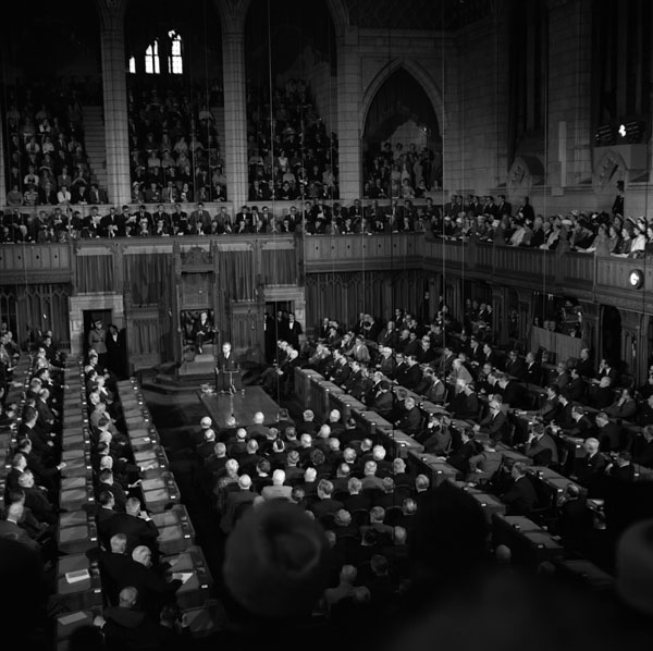 Le gouvernement King entama ses préparatifs d’après-guerre en déclarant en janvier 1944 qu’il s’engageait à lancer un programme national visant le plein emploi et la stabilité des prix et comprenant un éventail de mesures de sécurité sociale. Dès l’été, la première de ces mesures, un régime d’allocations familiales, figurait au menu législatif. Diefenbaker s’employa à vaincre les résistances du caucus conservateur à ce sujet, et ce fut surtout lui qui, au nom de son parti, dirigea le débat sur le projet de loi, adopté à l’unanimité en juillet. À l’automne, le gouvernement libéral dut affronter une crise parce que, afin de renforcer les troupes canadiennes en Europe, il revint sur ses engagements et réaffecta au front 16 000 conscrits pour le service intérieur. Diefenbaker et les conservateurs prirent le risque de perdre des votes dans la province de Québec en prônant, sans succès, la conscription de tous les hommes adultes pour le service outre-mer.