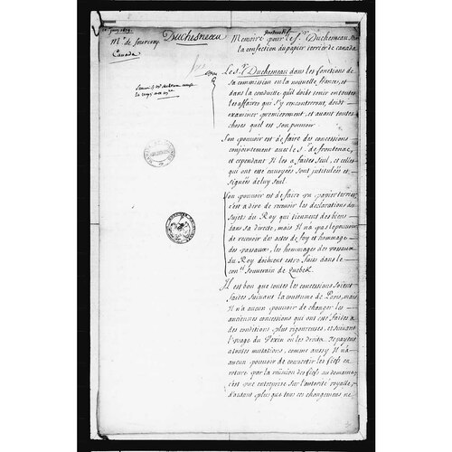 Duchesneau arriva à Québec au mois d’août 1675, porteur de l’édit du 5 juin précédent qui réorganisait le Conseil souverain. Il était pourvu d’un traitement de 12 000# par an et de 3 000 pour frais de voyages. La colonie avait été privée d’intendant depuis le départ de Jean Talon en 1672. Dans cet intervalle de trois années, c’est M. de Buade de Frontenac qui avait rempli la double fonction de gouverneur et d’administrateur. C’est peut-être à la suite de la querelle de Frontenac avec MM. de Fénelon [V. Salignac], sulpicien, et Perrot, gouverneur de Montréal, que le roi avait décidé de remplir la vacance d’intendant. Quoi qu’il en soit, Frontenac ne devait pas se réjouir de l’arrivée de ce haut fonctionnaire avec qui il allait être forcé de partager le pouvoir. Le 23 septembre eut lieu une séance du Conseil souverain. Selon les instructions qu’il avait reçues, l’intendant présida la réunion. Frontenac se crut lésé dans ses prérogatives et ordonna à Duchesneau de l’appeler par son titre de « chef et président du Conseil ». L’intendant refusa. Ce fut le début de sept années de querelles néfastes au progrès de la Nouvelle-France. Une correspondance volumineuse, échangée entre la métropole et la colonie, nous renseigne amplement à ce sujet. Les instructions du ministre sont aussi claires que la politique de Versailles. En thèse générale, le gouverneur représente le roi dans la colonie. Il est chef et, en quelque sorte, président honoraire du conseil. Par contre, l’intendant qui, par ordre de préséance, y occupe le troisième rang, après le gouverneur et l’évêque, en est le président effectif ; selon la déclaration du 5 juin 1675, l’intendant « demande les avis, recueille les voix et prononce les Arrets ».