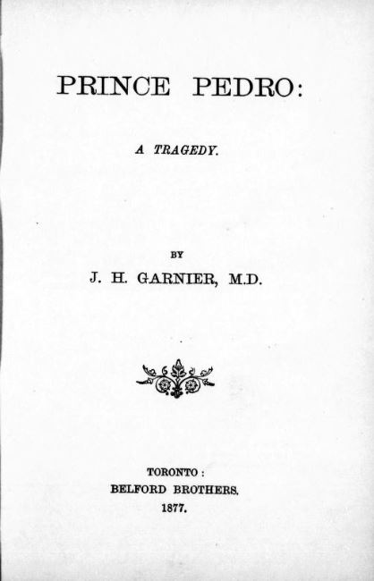 Titre original :  Prince Pedro : a tragedy by J.H. (John Hutchison) Garnier. Belford Bros, Toronto, 1877. From: https://archive.org/details/cihm_03294/page/n7/mode/2up.