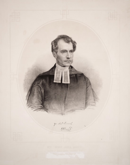 Henry Grasett amena sa famille à Québec en 1814, et Henry James y fit ses études à la Royal Grammar School. De 1825 environ à 1830, grâce à une bourse de la Society for the Propagation of the Gospel in Foreign Parts, Grasett étudia la théologie sous la tutelle de l’évêque Charles James Stewart*. En 1830, il s’inscrivit au St John’s College à l’University of Cambridge, et y obtint un baccalauréat ès arts en 1834, une maîtrise ès arts en 1842, un baccalauréat en théologie en 1853, ainsi qu’un doctorat honorifique en théologie en 1877. Il revint à Québec en 1834 et fut ordonné diacre le 19 mai de cette année, puis prêtre, le 8 juin 1835, par l’évêque Stewart. En 1835, Grasett commença sa longue carrière à Toronto en remplissant les fonctions de vicaire du rector John Strachan* à St James. Grasett devint aumônier personnel et théologien de Strachan en 1839, rector et aumônier de la garnison en 1847, et doyen en 1867. Malgré des différences dans leur façon d’exercer le ministère, toutes ces années-là, Grasett travailla de très près avec Strachan. Les deux hommes – le premier évêque et le premier doyen de Toronto – sont enterrés sous l’autel de St James.