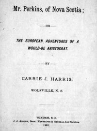 Même si elle n’est pas aussi connue que ses contemporaines, les romancières canadiennes Alice Jones* ou Sara Jeannette Duncan*, Carrie Jenkins Harris leur ressemble par l’origine locale de ses personnages implantés dans un décor international. Dans Mr. Perkins, elle fait ressortir l’aspect comique des prétentions de la famille Perkins à l’ascension sociale et oppose le personnage du jeune Tom Perkins à l’indifférence égoïste de l’aristocratie britannique et au maquignonnage d’escrocs de Londres et de Paris quand il entreprend le tour de l’Europe destiné à parfaire son éducation. Comme dans les cinq romans de Mlle Harris, le dénouement de l’intrigue de Mr. Perlons repose trop sur des coïncidences, mais le roman renferme néanmoins des commentaires mordants sur la prétention et met en scène des personnages originaux qui donnent de la vie au texte. L’Acadian de Wolfville le trouva « extrêmement bien écrit » et jugea qu’il faisait « le plus grand honneur au talent de l’auteure ». Toutefois, le journal fut moins enthousiaste pour Mr. Perkins dans sa critique de A romantic romance, publié en 1893, et déclara que le raffinement « de l’invention » et l’envergure de ce roman manquaient au premier. Avec Grand-Pré comme point de départ, à l’instar de A modern Evangeline qui parut en 1896, A romantic romance s’articule autour d’une fausse lettre et d’un malentendu entre deux amoureux qui serviront d’éléments catalyseurs à une idylle contrariée. Tels les héros de A modern Evangeline, des Néo-Écossais s’aventurent dans les grandes villes de New York et de Boston afin de poursuivre leurs études et leur carrière, et comme dans tous ses romans populaires, l’auteure ajoute sa touche moralisatrice : « Sois prudente, ma chère Eva. Si les vieilles braises se rallument rapidement, prends garde, dans ton cas, qu’elles ne s’enflamment subitement et n’enveloppent le bonheur de ta vie dans une redoutable conflagration. Pendant que tu prépares les pierres de la vengeance à jeter à ton amant d’autrefois, assure-toi d’être assez forte pour les lancer d’une main ferme, sinon elles peuvent rebondir et détruire ton propre cœur aimant. »