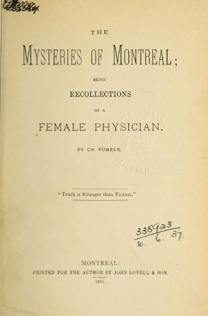 Charlotte Führer jugeait ce devoir suffisamment important pour écrire un livre qui soulignait les conséquences néfastes de l’immoralité. Publié à compte d’auteur à Montréal en 1881, The mysteries of Montreal rapportait, disait-elle, les antécédents de patientes confiés à ses soins. L’un des objectifs avoués du livre était de prévenir les écarts de conduite ; les lectrices se rendraient compte de l’angoisse qui guettait celles qui transgressaient la morale. Cependant, le ton sensationnel du livre et le recours à la licence poétique suggèrent que Mysteries pouvait bien avoir été conçu autant pour divertir ses lecteurs que pour illustrer les dangers de la transgression.