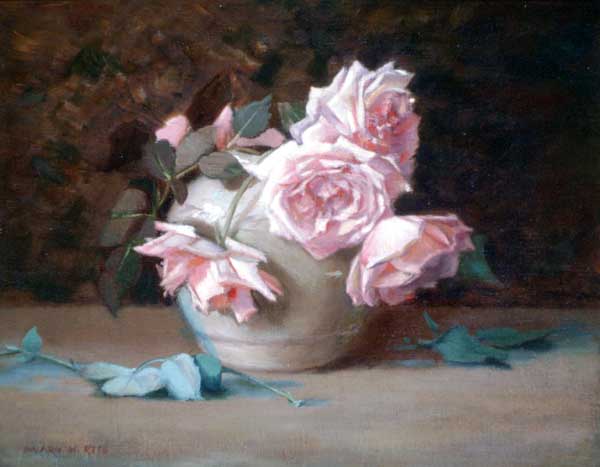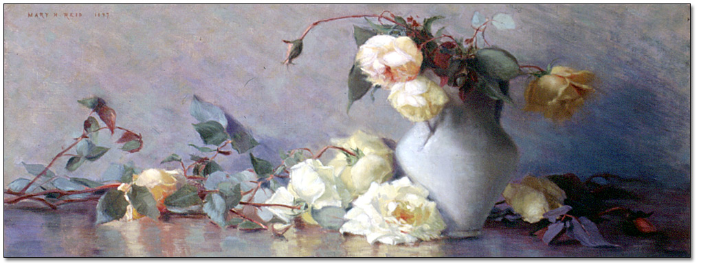 Mme Reid a laissé surtout des tableaux de chevalet et quelques aquarelles, mais elle a aussi peint un petit nombre de murales marouflées représentant des paysages. La plus fameuse de ces murales est une vue de la rivière Humber, réalisée pour l’hôtel de ville de Weston (Toronto) en 1912–1913. Mme Reid était cependant mieux connue comme peintre de natures mortes aux fleurs et, dès 1890, beaucoup la considéraient comme la meilleure peintre de fleurs du Canada. Les critiques vantaient tout particulièrement la finesse avec laquelle elle insufflait du « caractère » aux illustrations fidèles et purement botaniques que privilégiaient la plupart de ses prédécesseurs canadiens dans le genre. Mme Reid exposa régulièrement aussi des peintures représentant des jardins, des prairies et d’autres paysages domestiqués, des scènes nocturnes et, moins souvent, des intérieurs d’atelier et des études de personnages. Tout en empruntant au passage à l’impressionnisme, surtout dans les années 1880 et 1890, elle s’attacha durant toute sa carrière à travailler une gamme restreinte de couleurs susceptible d’évoquer une subjectivité poétique, comme dans A study in greys, tableau réalisé vers 1913. Ces peintures étaient typiques du tonalisme nord-américain de la fin du xixe et du début du xxe siècle. Cette palette l’attirait d’autant plus qu’elle lui rappelait les tableaux de Vélasquez, qu’elle avait étudiés et admirés à Madrid en 1896. Mme Reid incorporait aussi des éléments de l’esthétique de l’Américain James Abbott McNeill Whistler – entre autres les motifs orientaux que l’on trouve parfois dans ses natures mortes et ses scènes d’intérieur, par exemple dans Chrysanthemums : a Japanese arrangement (peint vers 1895) ; de temps en temps, elle employait aussi, comme Whistler, des titres suggérant des parallèles entre les arts visuels et la musique, par exemple Harmony in grey and yellow (1897). Plus que la plupart de ses contemporains, elle produisit des œuvres témoignant de ce souci décoratif présent aussi dans l’art nord-américain. En cela, elle avait l’appui de critiques tels que Hector Willoughby Charlesworth* du Saturday Night, qui a dit de ses peintures qu’elles possédaient un « raffinement exquis ». Malheureusement, en expliquant cette sensibilité féminine idéalisée qu’il voyait dans ses œuvres, Charlesworth eut recours au cliché ; il souligna en effet que Mme Reid était un modèle d’humble et gracieuse féminité – la parfaite compagne d’un plus célèbre mari. Mme Reid ne dit ni ne fit pas grand-chose pour démolir cette image. « Rien ne peut l’inciter à parler de ses tableaux », nota Marjory Jardine Ramsay MacMurchy* dans le Globe en 1910. Pourtant, Mme Reid se percevait clairement comme une artiste professionnelle. Un poème à sa mémoire publié en 1921 dans le Daily Mail and Empire et reproduit dans le Canadian Theosophist de Toronto, le rappellerait : « [Elle] vivait pour travailler et répandre le bonheur ; / et cela comblait son cœur de joie. » En l’absence de documentation plus fiable, toutefois, on ne peut affirmer rien de plus sur la personnalité de Mme Reid, et les deux principaux portraits d’elle qu’a exécutés son mari ne nous permettent que des conjectures.