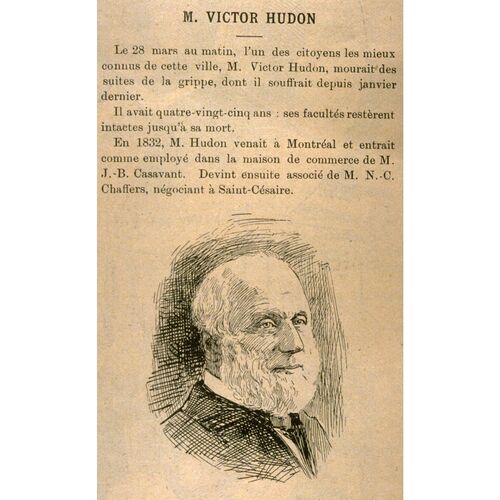 HUDON, VICTOR, homme d’affaires, né le 31 août 1812 à Rivière-Ouelle, Bas-Canada, fils d’Alexandre Hudon et de Julie Chapais (Chapet) ; le 20 juillet 1835, il épousa à Montréal Marie Godard, et ils eurent trois filles et six fils, puis le 31 juillet 1866, dans la même ville, Philomène Godard ; décédé le 28 mars 1897 au même endroit.