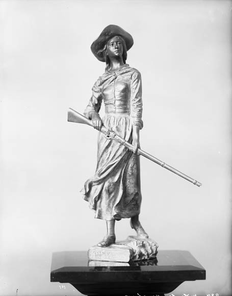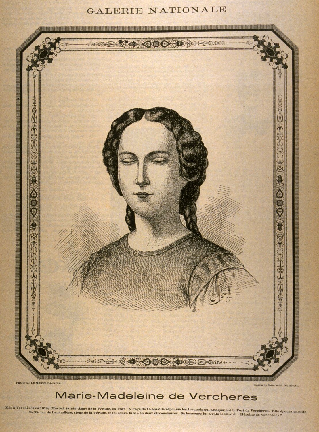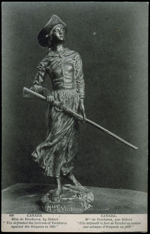 La Potherie : « mais elle conserva dans le moment plus d’assurance que n’en pouvait avoir une Fille de quatorze ans, elle lui laissa entre les mains son mouchoir de col se jettant dans son Fort, dont elle ferma la porte sur elle en criant aux armes, & sans s’arrêter aux gémissements de plusieurs femmes désolées de voir enlever leurs maris, elle monta sur un Bastion où était la Sentinelle ».